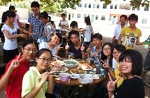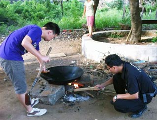 在三教村,志愿者受到了當年解放軍進城的待遇。由于小學在施工不便住宿,村民便打開自家新裝修的房子請隊員們住。接著隊員們到露天廚房大展身手,灶臺是由幾個石頭和一個大鐵鍋搭建而成。指導老師看大家興致高,也過來起火,燒柴。有天傍晚,烏云密布,眼瞅著雨就要掉下來,為了能讓志愿者們下雨前吃到飯,熱心的村民為志愿者們買醬料,給他們燒起了飯。