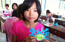 活動現(xiàn)場,孩子們盡情發(fā)揮自己的想象,用有限的廢紙、易拉罐等廢棄材料創(chuàng)造出了各種富有特色的手工藝作品。許多學生的創(chuàng)意作品超出了隊員們的想象,隊員們?nèi)滩蛔∨氖纸泻。雷州市烏石?zhèn)三教小學六年級學生用日?梢姷囊桌奁吭O計出簡易的小垃圾桶。將平凡的垃圾桶擬人化,還在設計出來的垃圾桶上寫著“保護環(huán)境、愛護家園”等標語。二年級學生設計出的綠色太陽花,說那是一朵綠花,那是一個希望。
