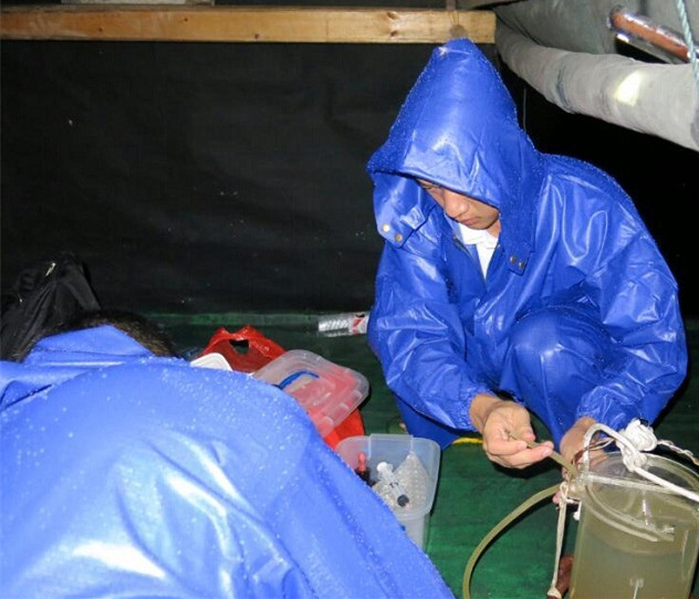 7月10日夜晚,隊員們冒著大雨進(jìn)行水樣分析