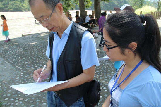 副隊(duì)長(zhǎng)呂悅帶領(lǐng)的一隊(duì)隊(duì)員向游客分發(fā)調(diào)查問(wèn)卷,了解他們對(duì)生態(tài)文明建設(shè)和中國(guó)夢(mèng)的看法。