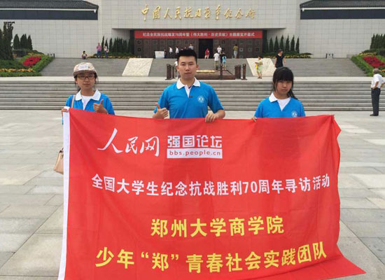 7月16日,鄭州大學(xué)“少年鄭青春”暑期實(shí)踐隊(duì),開展了“緬懷革命先烈,樹立信心實(shí)現(xiàn)中國夢(mèng)”實(shí)踐活動(dòng)。團(tuán)隊(duì)通過抗戰(zhàn)知識(shí)調(diào)研、參觀抗戰(zhàn)紀(jì)念館、采訪抗戰(zhàn)老兵、向幼兒園孩子普及抗戰(zhàn)知識(shí)等方式紀(jì)念抗戰(zhàn)勝利70周年。