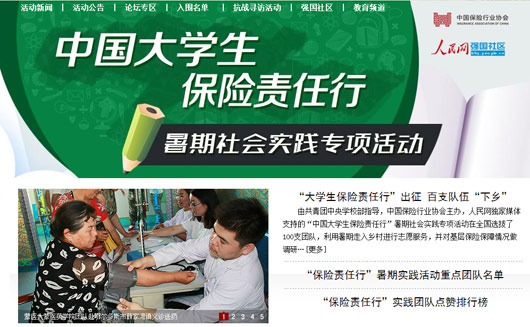 本次活動(dòng)從全國(guó)27個(gè)省市100多所高校選拔出100支入圍團(tuán)隊(duì),在暑期分別以支教、環(huán)保、醫(yī)療、調(diào)研等形式服務(wù)鄉(xiāng)村,提高當(dāng)?shù)鼐用癜踩庾R(shí),提升社會(huì)對(duì)安全教育問題的關(guān)注,同時(shí)開展調(diào)研,了解基層保險(xiǎn)保障相關(guān)情況。各團(tuán)隊(duì)實(shí)踐期間在人民網(wǎng)強(qiáng)國(guó)社區(qū)活動(dòng)專區(qū)實(shí)時(shí)播報(bào)實(shí)踐進(jìn)程,發(fā)回稿件數(shù)千篇。大學(xué)生們積極走入社會(huì)、服務(wù)基層的實(shí)際行動(dòng)贏得50萬(wàn)網(wǎng)友為他們“點(diǎn)贊”。