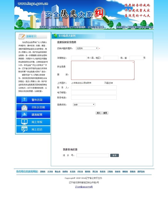 1、直接登錄遼寧省公安廳門戶網(wǎng)站開設(shè)的“安全隱患大家糾”活動(dòng)專欄(http://www.lnga.gov.cn/ztzl/aqyhdjj/ ),按欄目提示錄入您發(fā)現(xiàn)的安全隱患線索;