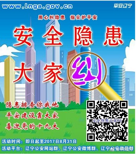 為深入貫徹落實(shí)習(xí)近平總書記系列重要講話精神,充分發(fā)揮全省“網(wǎng)上公安機(jī)關(guān)”平臺(tái)作用,遼寧省公安廳從即日起至8月31日,組織全省公安機(jī)關(guān)依托各級(jí)公安政務(wù)網(wǎng)站、公安政務(wù)微博、公安政務(wù)微信平臺(tái),集中開展“安全隱患大家糾”活動(dòng),全面開啟遼寧公安“查患治患”工作的“互聯(lián)網(wǎng)+”模式。