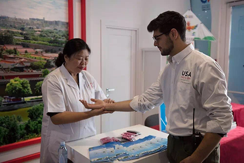 當(dāng)薩仁在中國(guó)館尾廳進(jìn)行綠色中醫(yī)針灸展示時(shí),不時(shí)有好奇的游客上來體驗(yàn)。一位在中國(guó)館交流的美國(guó)館志愿者也想親身體驗(yàn)中醫(yī)針灸。短暫的號(hào)脈后,薩仁說:“這小伙子體格很好,就是手腳會(huì)在冬天發(fā)涼!闭f著便幫美國(guó)館志愿者進(jìn)行舒解經(jīng)絡(luò)的治療。