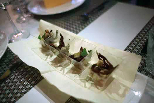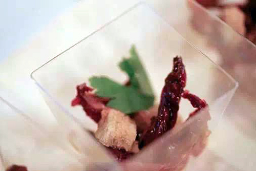 牛肉選用的是最嫩的腿肉部分,加入香料,文火慢燉,晾涼,切薄片后,上面覆蓋金槍魚醬汁。肉香與魚的鮮美巧妙的結合,清淡與濃稠交合,一軟一硬,正詮釋了美食藝術的和諧之處。在盛夏中,享受著浪漫的地中海的陣陣清爽的海風。