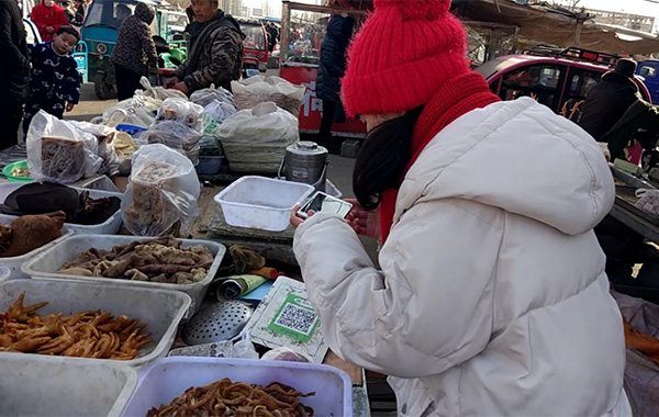 “小伙子,手機(jī)帶了嗎?掃一掃,你就用微信付款吧!”這是攤販大爺?shù)穆曇。江蘇徐州市豐縣的“閆家小旭”對家鄉(xiāng)集市上菜攤前的二維碼,頗為吃驚,不敢相信。她說:“不到一年時間,發(fā)現(xiàn)家鄉(xiāng)變化真得好大。中國特色社會主義‘走進(jìn)新時代’,農(nóng)村里的樓房越蓋越高,院子也越來越寬敞。鄉(xiāng)間小道變成平整寬闊的水泥路,飛奔的火車也通往家鄉(xiāng)。手機(jī)支付走進(jìn)鄉(xiāng)間集市攤販,西紅柿、茄子、黃瓜、豆角等反季節(jié)蔬菜也成為春節(jié)餐桌上的家常菜!