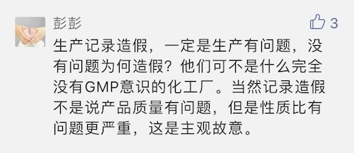 也有網(wǎng)友認(rèn)為:“生產(chǎn)記錄造假一定是生產(chǎn)有問題,沒問題為什么造假?他們可不是沒有GMP意識的化工廠。當(dāng)然記錄造假不是說產(chǎn)品質(zhì)量有問題,但是性質(zhì)比問題更嚴(yán)重,這是主觀故意!