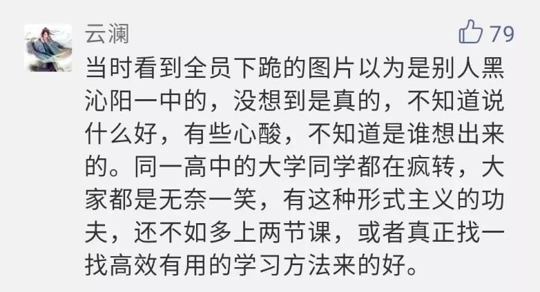 視頻發(fā)布后引發(fā)了網(wǎng)友討論。有人質(zhì)疑此活動(dòng)過于“形式主義”,遭學(xué)校官號(hào)怒懟:思維是不是有毛病?11月21日,該所學(xué);貞(yīng)稱,校領(lǐng)導(dǎo)在活動(dòng)前不知情,是高三年級(jí)安排的,下跪只是一種形式,想教孩子們學(xué)會(huì)感恩。