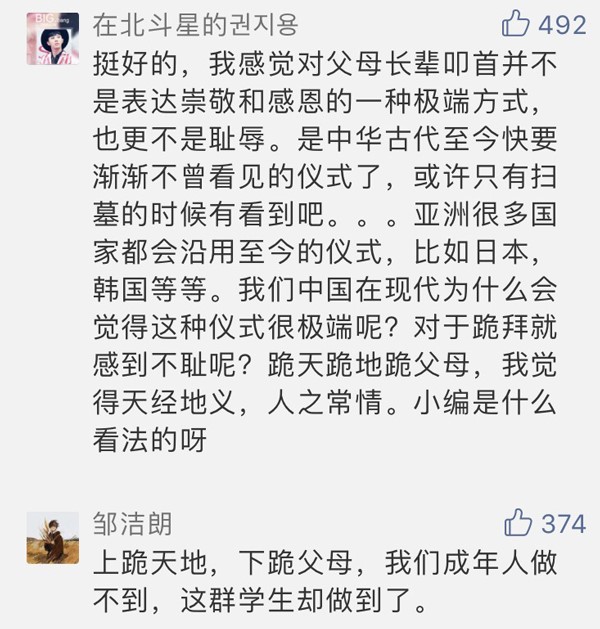 有網(wǎng)友表達(dá)支持:“生活需要儀式感,跪天跪地跪父母有啥可質(zhì)疑?”