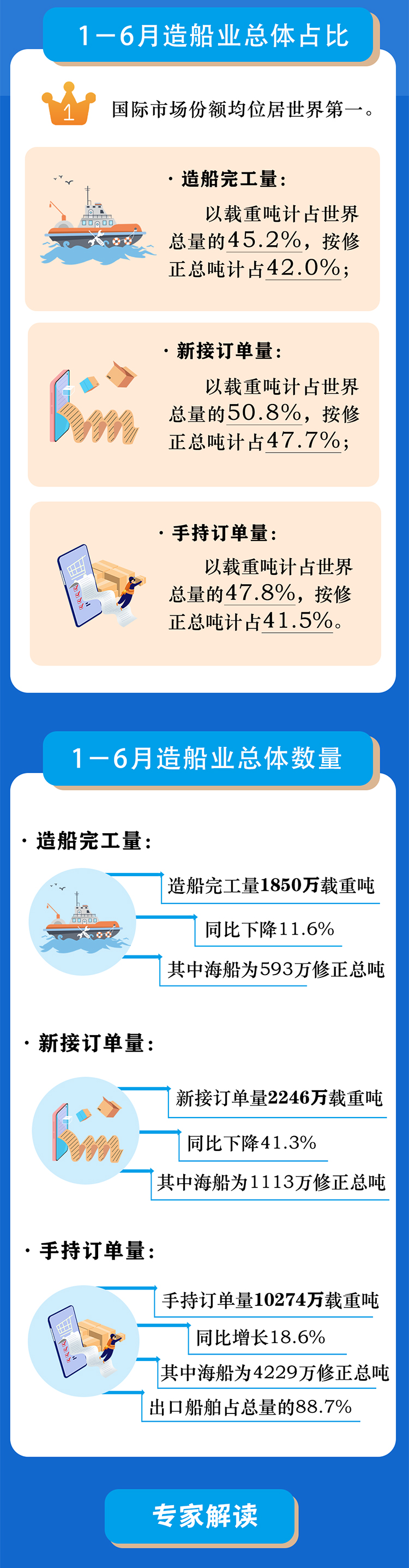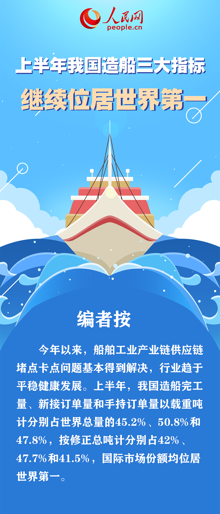 今年上半年,我國造船完工量、新接訂單量、手持訂單量三大指標(biāo)在國際市場的份額繼續(xù)位居世界第一。分別占世界總量的45.2%、50.8%和47.8%,按修正總噸計分別占42.0%、47.7%和41.5%。