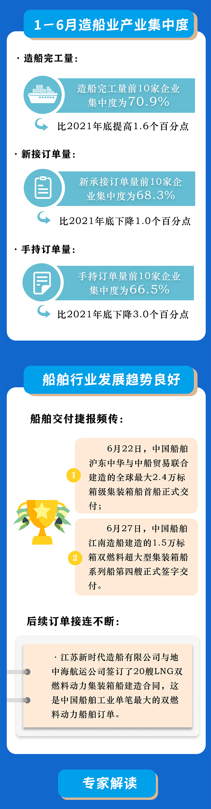 “上半年中國船舶工業(yè)克服不利影響,主要指標(biāo)繼續(xù)保持世界第一,這是一個了不起的成績!敝袊肮I(yè)行業(yè)協(xié)會秘書長李彥慶在接受人民網(wǎng)“強觀察”欄目記者采訪時表示,上半年我國船舶工業(yè)呈現(xiàn)出五方面特點:一是接單的船型結(jié)構(gòu)不斷優(yōu)化。從以散貨船和油船等傳統(tǒng)船型為主,到現(xiàn)在散貨船、油船、集裝箱船、氣體船、客船以及特種船舶均衡發(fā)展。二是重點船型加速突破,新型裝備不斷涌現(xiàn)。今年上半年,大型LNG運輸船成交30艘,創(chuàng)造歷史新記錄;汽車運輸船市場份額穩(wěn)居世界第一;海上風(fēng)電安裝船、深遠(yuǎn)海養(yǎng)殖裝備等新型海洋裝備實現(xiàn)批量接單。三是手持訂單不斷增長,為加快轉(zhuǎn)型升級奠定堅實基礎(chǔ)。當(dāng)前,國內(nèi)大部分企業(yè)訂單已能滿足2~3年生產(chǎn)量,基本解決了持續(xù)生產(chǎn)經(jīng)營的問題。四是產(chǎn)業(yè)結(jié)構(gòu)日趨合理,“專精特新”發(fā)展理念逐步深入。五是跨行業(yè)融合發(fā)展的“產(chǎn)業(yè)生態(tài)體系”逐步建立。