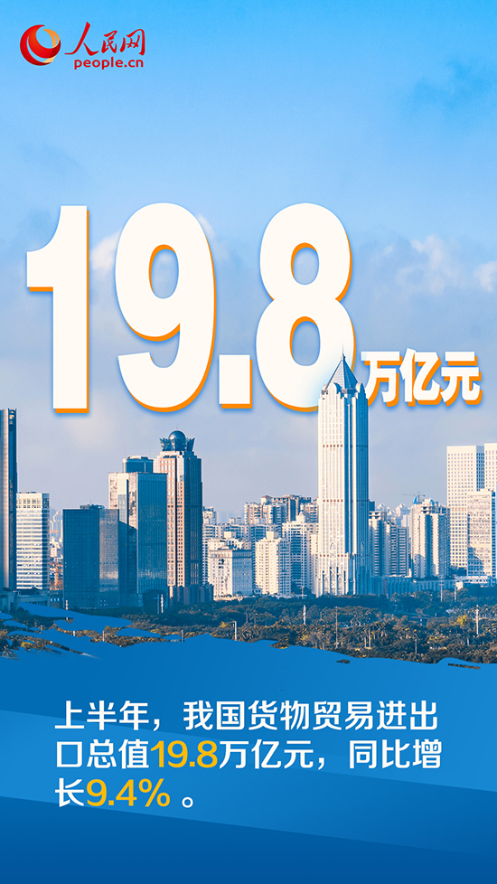 據(jù)海關(guān)統(tǒng)計,今年上半年我國貨物貿(mào)易進出口總值19.8萬億元,同比增長9.4%。其中,出口11.14萬億元,增長13.2%;進口8.66萬億元,增長4.8%……上半年外貿(mào)進出口“答卷”傳遞出我國經(jīng)濟持續(xù)恢復的積極信號。