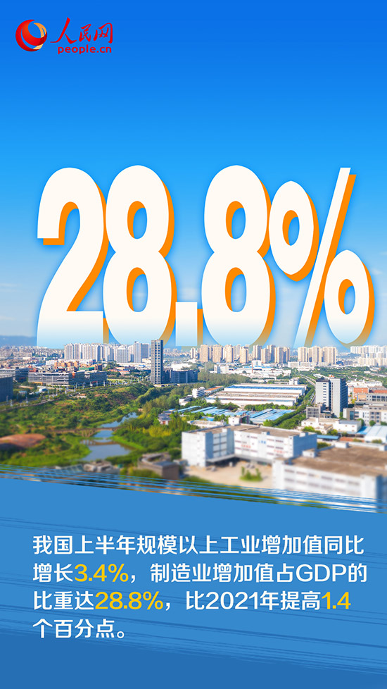 上半年,在各地區(qū)各部門共同努力下,盡管面臨疫情沖擊,產(chǎn)業(yè)鏈供應(yīng)鏈日益穩(wěn)定暢通,工業(yè)經(jīng)濟迅速扭轉(zhuǎn)了下滑態(tài)勢,實現(xiàn)了恢復(fù)增長。國新辦7月19日舉行發(fā)布會介紹,今年上半年,我國規(guī)模以上工業(yè)增加值同比增長3.4%,規(guī)模以上制造業(yè)增加值同比增長2.8%,制造業(yè)增加值占GDP的比重達28.8%,比2021年提高1.4個百分點。