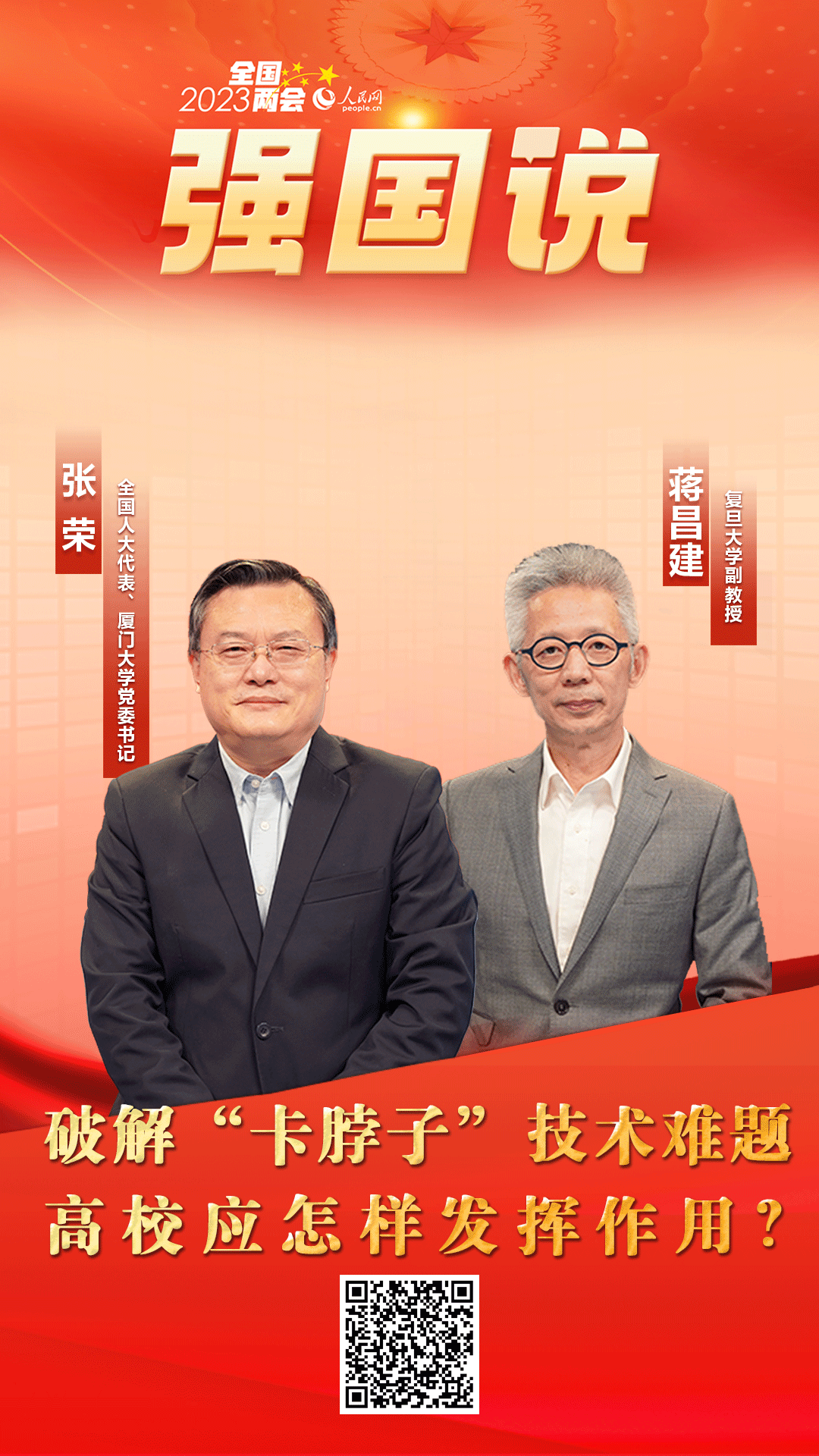 教育、科技、人才是全面建設(shè)社會(huì)主義現(xiàn)代化國家的基礎(chǔ)性、戰(zhàn)略性支撐。2023年全國兩會(huì)期間,人民網(wǎng)《強(qiáng)國說》欄目邀請(qǐng)全國人大代表、廈門大學(xué)黨委書記張榮與復(fù)旦大學(xué)副教授蔣昌建,就相關(guān)話題展開探討交流。